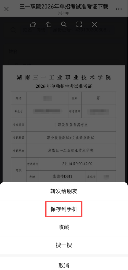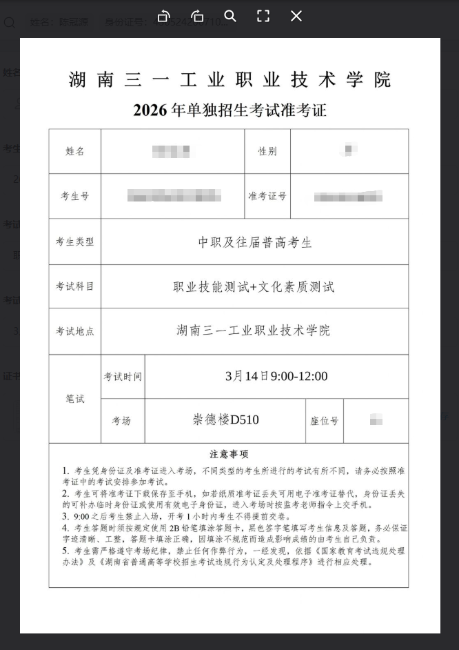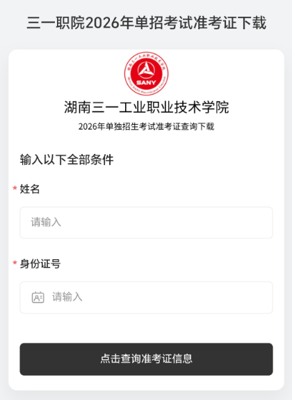 各位考生及家长: 欢迎报考我校,现将我校2026年单招一志愿考试有关事项提醒如下: 考试时间:2026年3月14日9:00-12:00 考试地点:湖南三一工业职业技术学院崇德楼 应届普高:职业适应性测试(文化成绩采用高中学业水平考试) 中职及往届或同等学历:文化测试+职业技能测试 体育特长生:文化测试+体育特长生专项测试 请所有考生带好身份证、准考证、考试必备文具(2B铅笔、签字笔、橡皮擦等)准时参加考试。 第一步:点击下方链接或者扫描下方二维码进入准考证查询 https://jsj.top/f/vDbDeR/s/zRPsYx 第二步:输入姓名及考生号,点击准考证查询信息 第三步:生成准考证 第四步:保存下载 手机端:待弹出电子准考证后长按保存到手机即可打印 电脑端:待弹出电子准考证后右键点击保存图片即可下载打印 长沙火车站——三一职院 公共交通:长沙火车站(地铁2号线)➡人民东路站(换乘地铁6号线)➡龙华站(地铁6号线)➡三一职院 驾 车:16-18公里,预计时间30-45分钟 的 士:预计费用50元 长沙火车南站——三一职院 公共交通:长沙火车南站(地铁2号线)➡人民东路站(换乘地铁6号线)➡龙华站(地铁6号线)➡三一职院 驾 车:10-12公里,预计时间15-20分钟 的 士:预计费用35元 长沙黄花机场——三一职院 公共交通:黄花机场T1T2站(地铁6号线)➡龙华站(地铁6号线)➡三一职院 驾 车:11-13公里,预计时间15-20分钟 的 士:预计费用30元 汽车西站——三一职院 公共交通:望城坡站(地铁2号线)➡人民东路站(换乘地铁6号线)➡龙华站(地铁6号线)➡三一职院 驾 车:35-40公里,预计时间45-55分钟 的 士:预计费用85元 汽车南站——三一职院 公共交通:汽车南站综合交通枢纽站(262路公交)➡雨花大道劳动路口站(换乘X220路公交)➡福田汽车站➡三一职院 驾 车:20-25公里,预计时间25-35分钟 的 士:预计费用55元 1、请各位考生提前熟悉来校路线,其他市州或距离较远的考生建议在考试前一天入住学校附近酒店,避免错过考试。 2、请考生携带手机,保存好电子准考证及身份证,凭准考证、身份证参加考试。